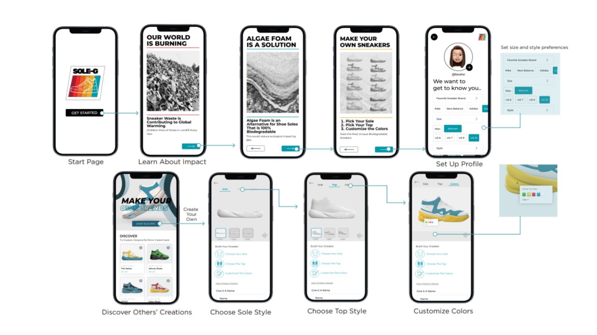 The algae sole became the anchor. A material that is renewable, purposeful, and genuinely interesting, the kind of detail a sneakerhead notices and talks about. From there, the design presets gave users a framework to work within, curated starting points that carried the sustainable logic without making it feel like a restriction. User testing pushed the work further, revealing that the sustainability message needed to be woven into the experience rather than announced by it. By the time the final design came together, SOLE-G had stopped feeling like a responsible alternative and started feeling like something people would actually want to own.